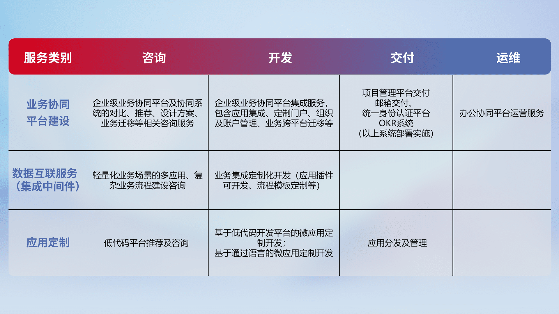 针对钉钉、、、企微、、IDaas等平台级产品提供产品的规划、、方案、、交付、、定制化开发等服务,,,,实现如统一协同办公、、智能客户服务、、、、混合会议管理、、、、智能数据查询、、等业务场景,,实现数字化转型。。。