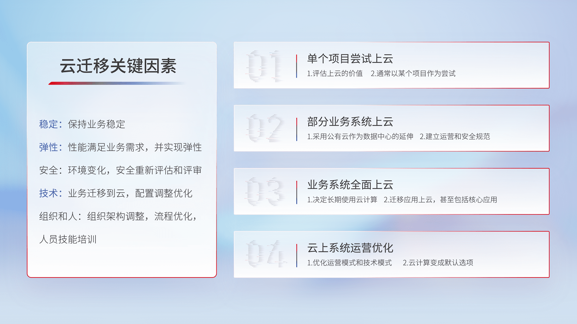 结合实际业务,,从规划设计、、、云平台选型、、、、云原生改造、、、、数据迁移、、、集成交付,,,迁移全过程为客户识别最佳上云路径,,,,做好风险识别管理,,设计网络架构、、身份权限、、安全审计合规、、、、操作审计、、日志审计、、监控告警策略、、、、多站点容灾设计等,,,,对云上基础设施进行整体规划,,提升IT治理水平,,以满足弹性、、、高可用、、高性能的需求。。