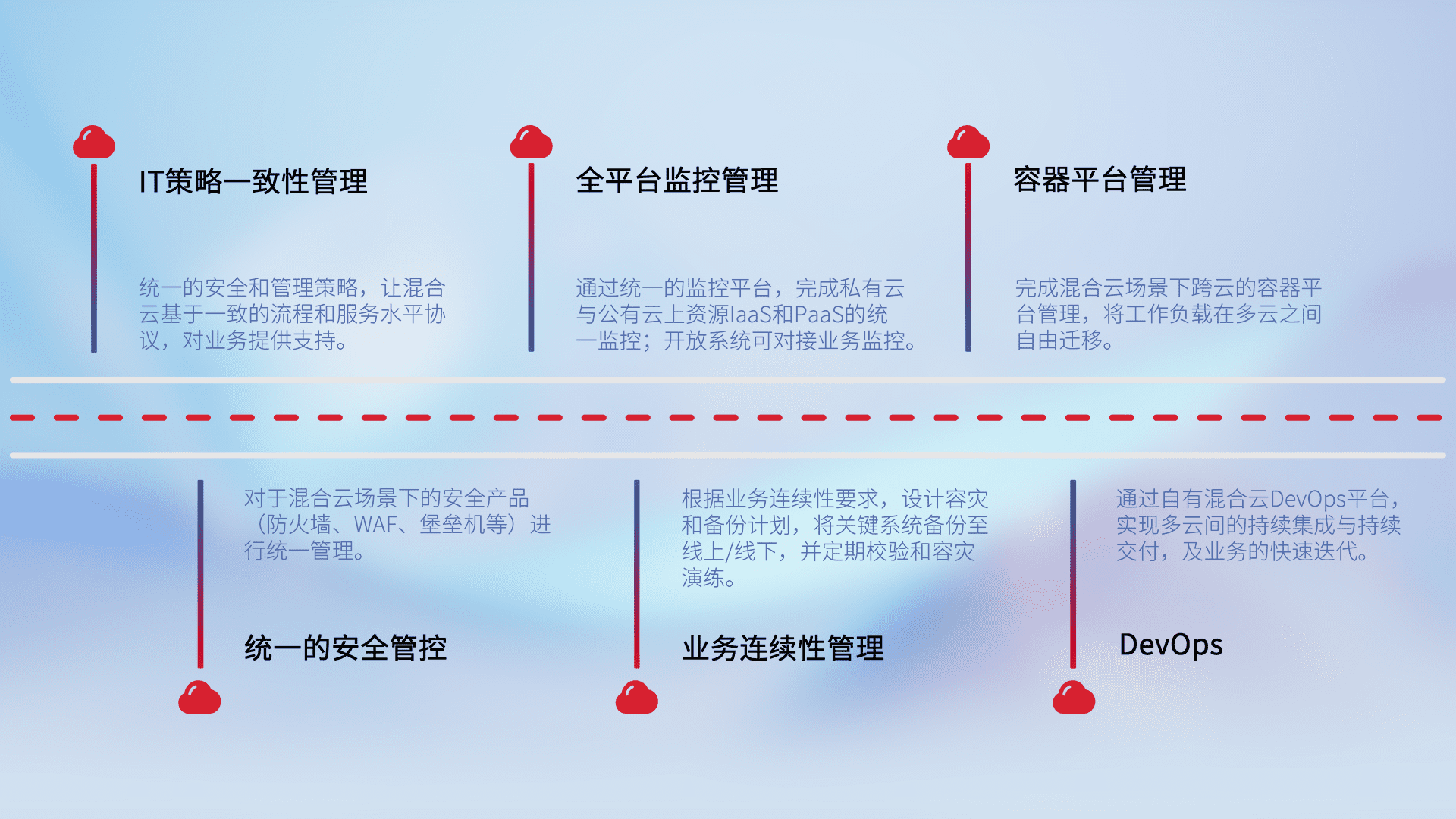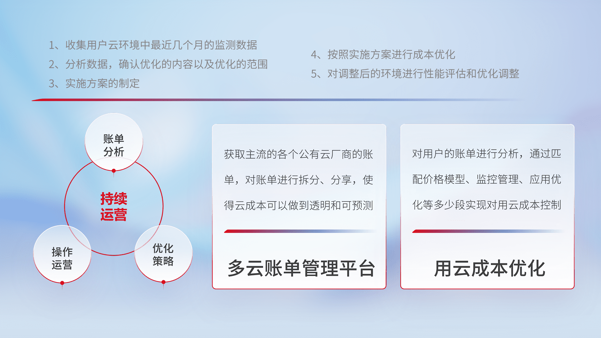 通过多云纳管,,,,以统一的资源数据模型把客户的云资源进行抽象和封装,,,,进而实现对多云资源的统一操作,,,,保障云资源管理的可靠性、、、、稳定性与可用性。。量身定制化运维内容,,,,配置、、、开发运维、、、、补丁管理、、备份、、、、监控、、、认证和访问管理、、、、审计和日常巡检等,,,保障在用云过程中的可靠度,,,,稳定度以及高可用率。。